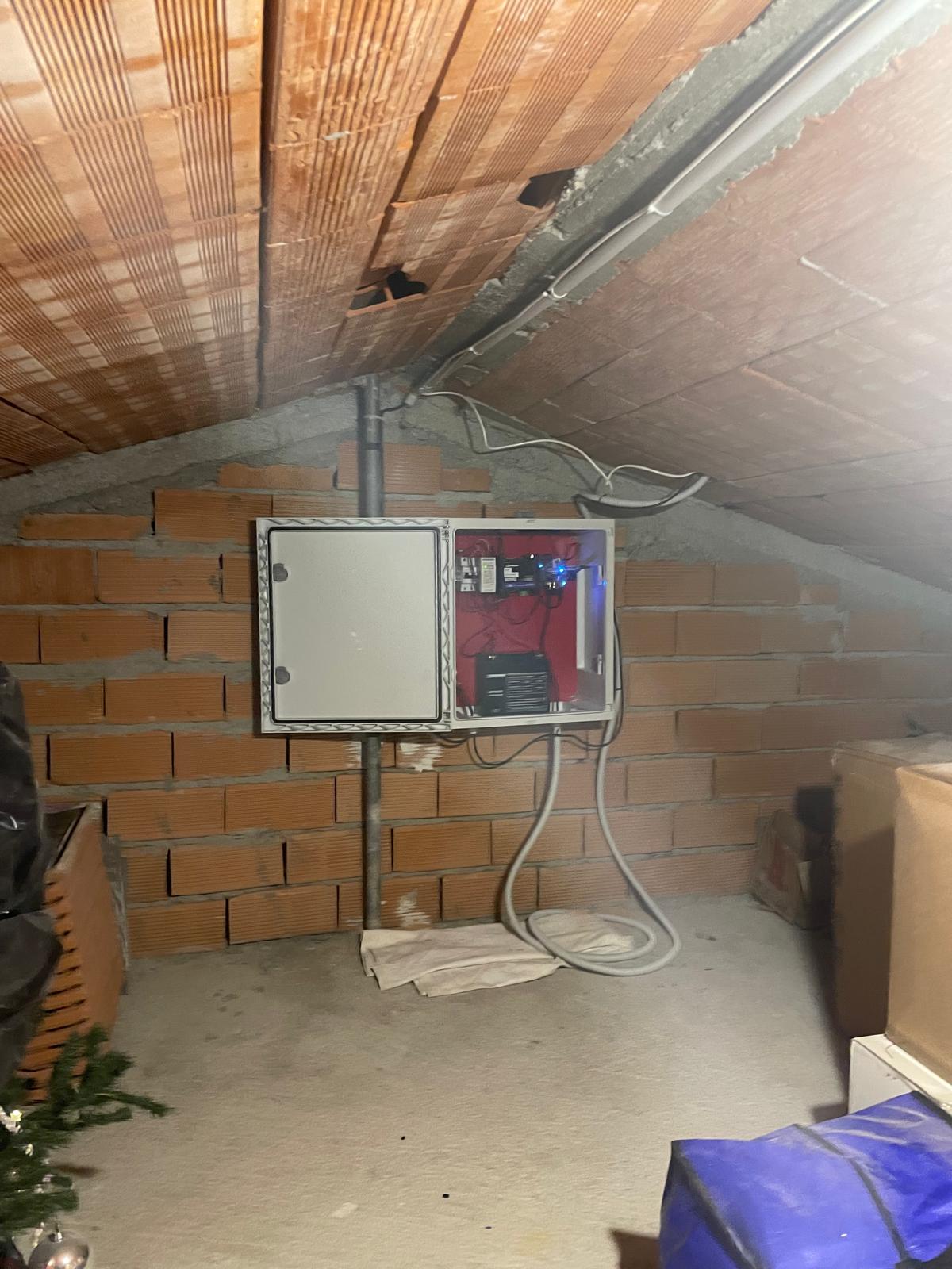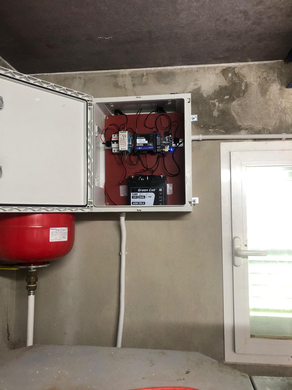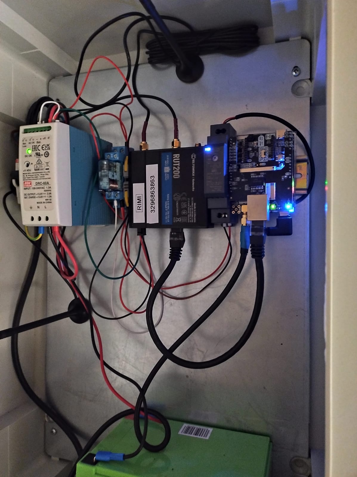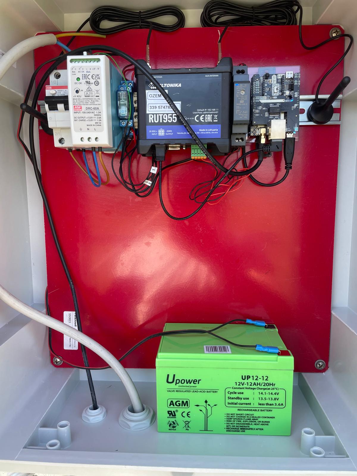 - Cablaggio interno, diversi cavi di alimentazione (neri e rossi) che collegano la batteria, l’alimentatore, il router e la scheda GNSS. Presente un piccolo connettore a morsetti per collegare e organizzare i fili di potenza o segnale. Un cavo USB (o simile) sembra alimentare o interfacciare la scheda in alto a destra.