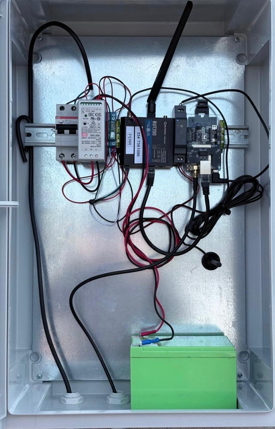 - Modulo di alimentazione su guida DIN. Di colore chiaro/bianco, montato sul lato sinistro, un alimentatore o un convertitore (ad esempio un modello “Mean Well”), che fornisce tensione stabile a router, batteria e scheda GNSS.